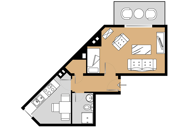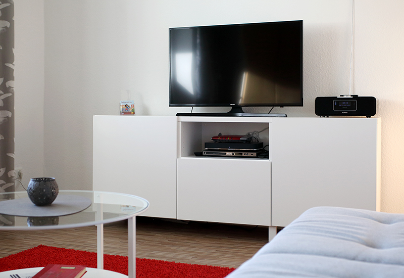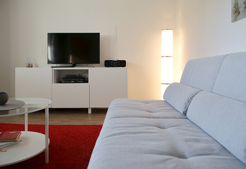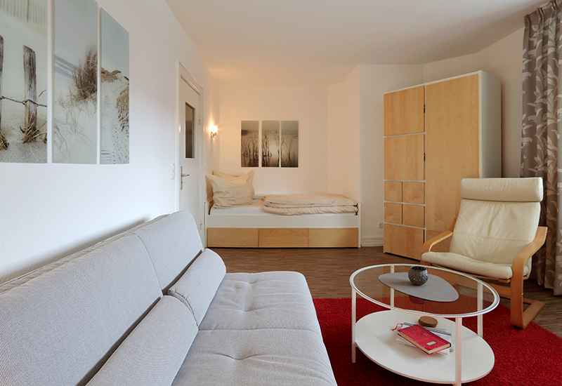 Die 1-Zimmer-Gästewohnung ist komplett eingerichtet und verfügt über drei Schlafplätze für Erwachsene (ein Doppelbett-Schlafsofa und ein Einzelbett, komplett mit Bettzeug und Bettwäsche). Für ein Baby oder Kleinkind halten wir ein Reisebett (hierfür bitte Bettzeug und Bettwäsche selbst mitbringen) sowie einen Hochstuhl bereit. Ferner stehen eine vollständig ausgerüstete Küche, ein Duschbad (inkl. Föhn), ein TV und eine HiFi-Anlage zu Ihrer Verfügung. Es besteht außerdem die Möglichkeit zur kostenlosen WLAN-Nutzung. Auch die Bettwäsche gehört zu unserem Service.