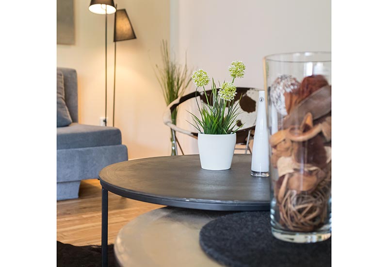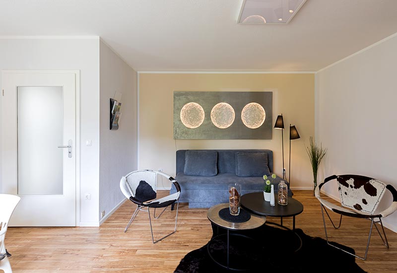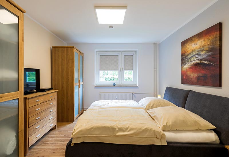 Die 2-Zimmer-Gästewohnung ist komplett eingerichtet und verfügt über vier Schlafplätze für Erwachsene (ein Doppelbett-Schlafsofa und ein Doppelbett, komplett mit Bettzeug und Bettwäsche). Für ein Baby oder Kleinkind halten wir ein Reisebett (hierfür bitte Bettzeug und Bettwäsche selbst mitbringen) sowie einen Hochstuhl bereit. Ferner stehen eine vollständig ausgerüstete Küche, ein Duschbad (inkl. Föhn), zwei TV und eine HiFi-Anlage zu Ihrer Verfügung. Es besteht außerdem die Möglichkeit zur kostenlosen WLAN-Nutzung. Auch die Bettwäsche gehört zu unserem Service.