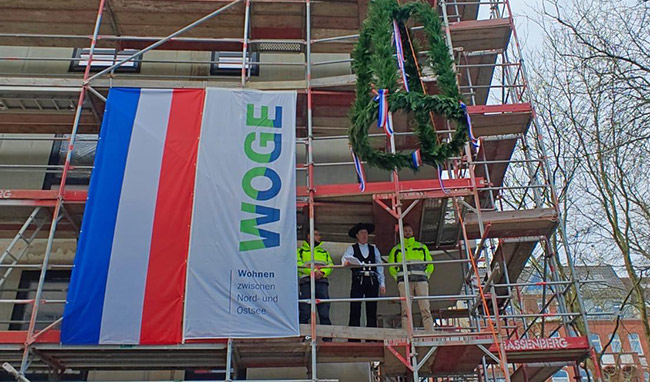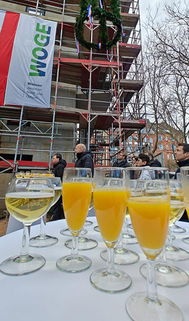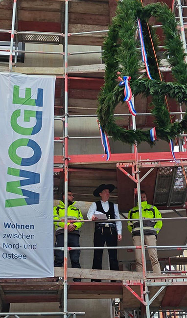 Im Herbst 2020 fiel der Startschuss für das Neubauvorhaben „Wohnpark Wiker Quartier“ in Kiel-Wik. Am 15.12.2021 folgte offiziell der 1. Spatenstich und am 06.07.2023 die traditionelle Grundsteinlegung. Genau sieben Monate später findet nun das Richtfest für das „Gebäude 1“ und das sogenannte Dichtfest für das „Gebäude 2“ statt. Auf insgesamt rd. 3.800 m² Wohnfläche wird hier barrierearmer Wohnraum für 59 Haushalte und eine Gästewohnung geschaffen.